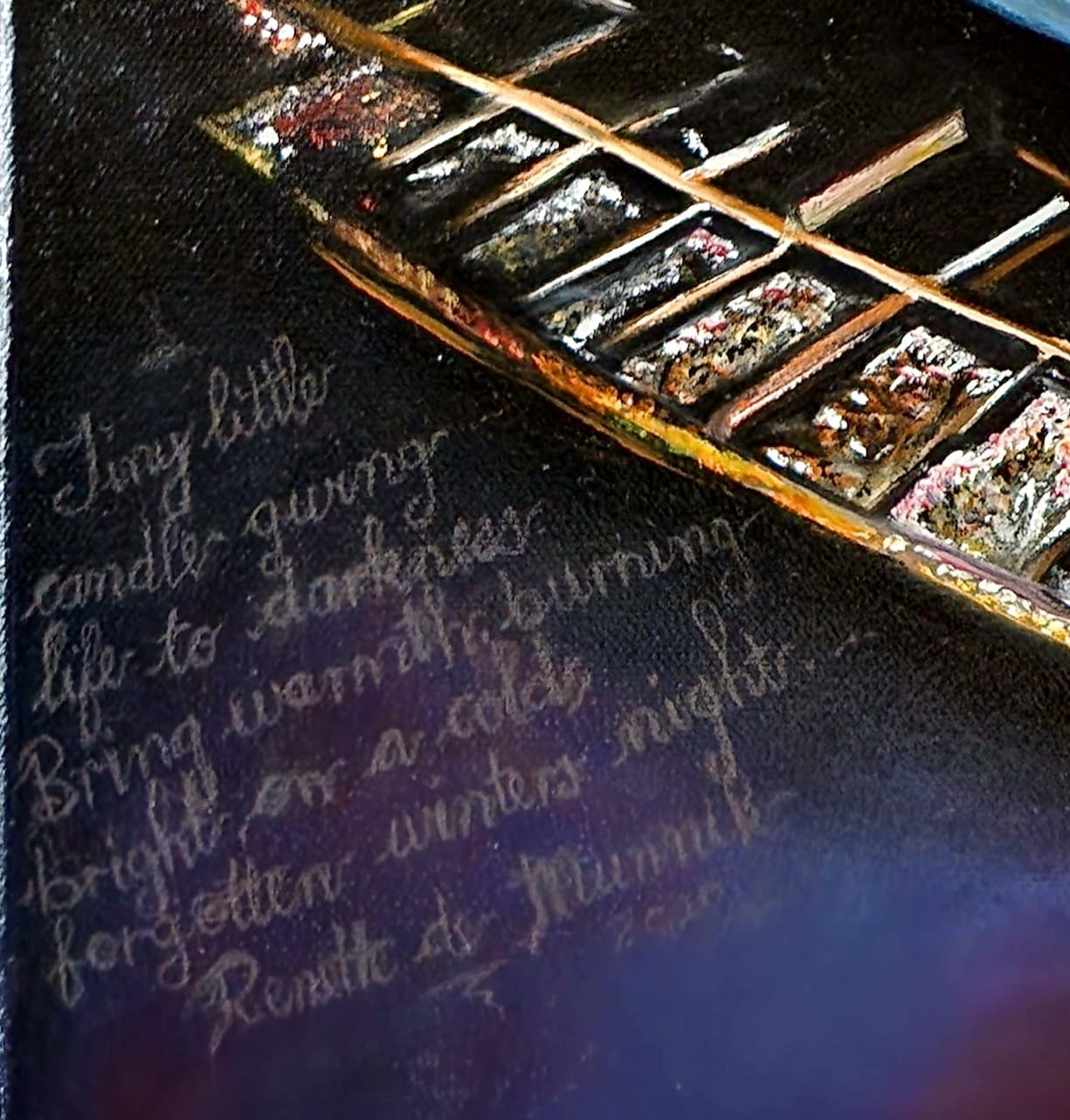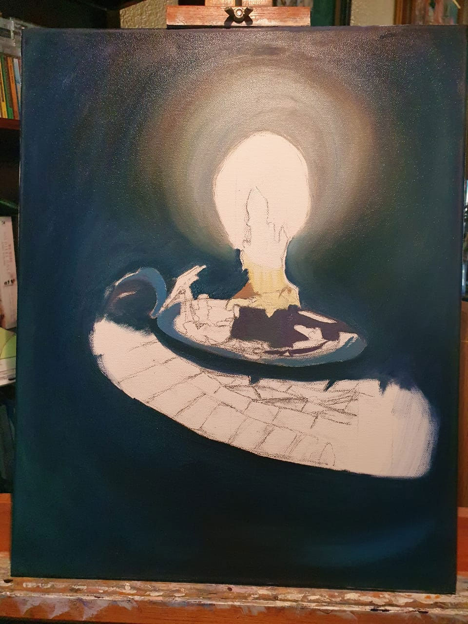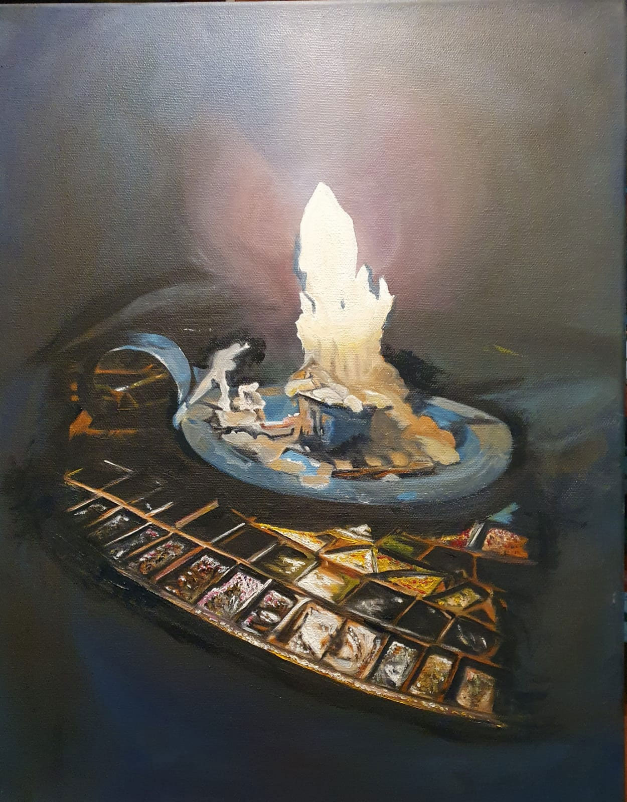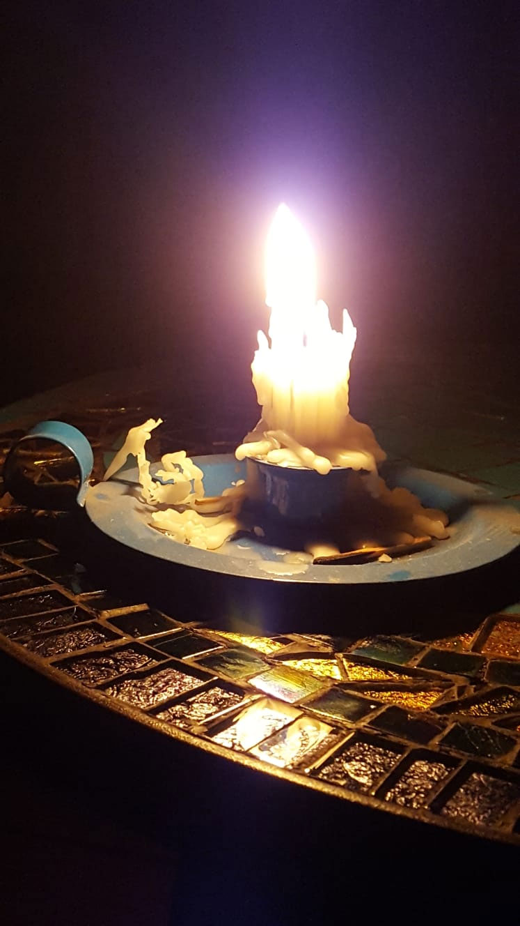The candle casting its warm glow upon the intricately tiled mosaic table was a mesmerizing sight, begging to be immortalized. Amidst a power outage, I seized the opportunity to encapsulate this moment, freezing it in time through the lens of my camera. Little did I anticipate that the very mosaic table, a creation of my own hands, would one day be part of my oil painting. I found myself inspired to craft a poem, weaving words that mirrored the essence of this evocative scene. Truly, it is an authentic creation, a testament to the beauty that emerges from the depths of one’s own imagination.
