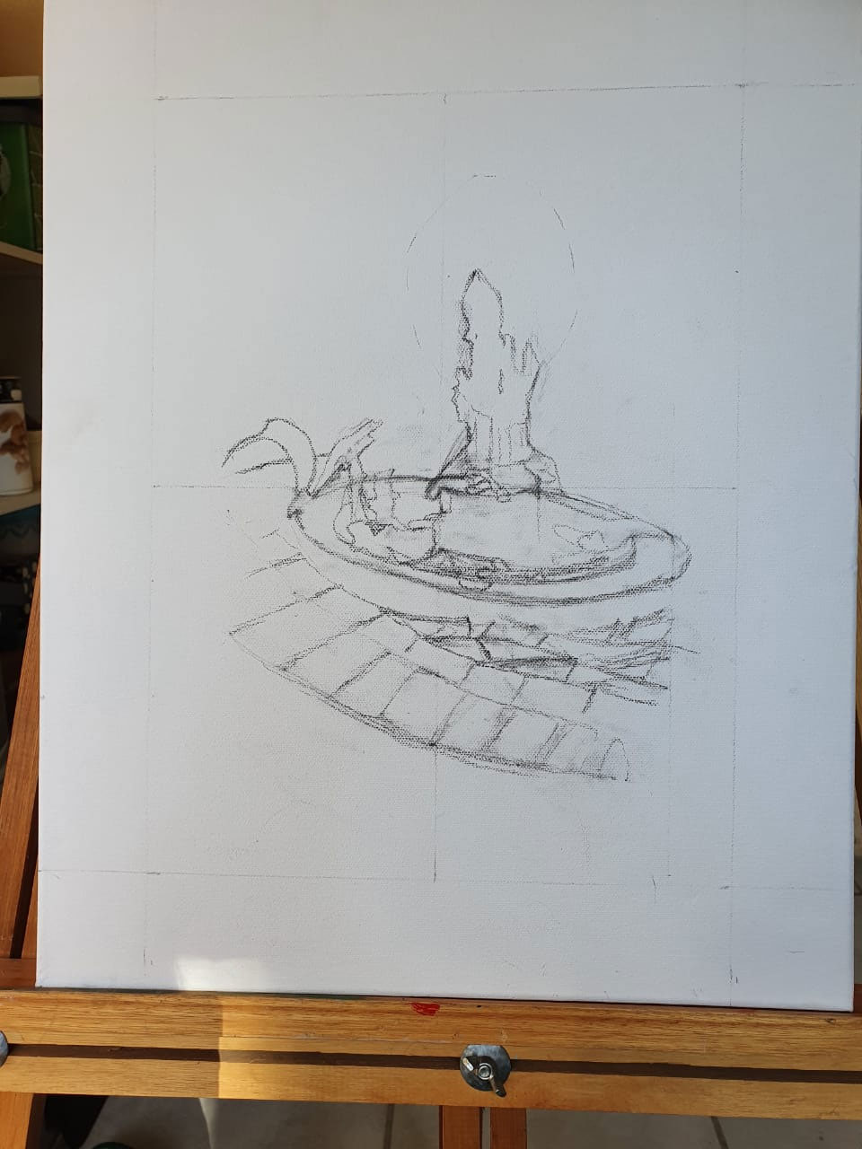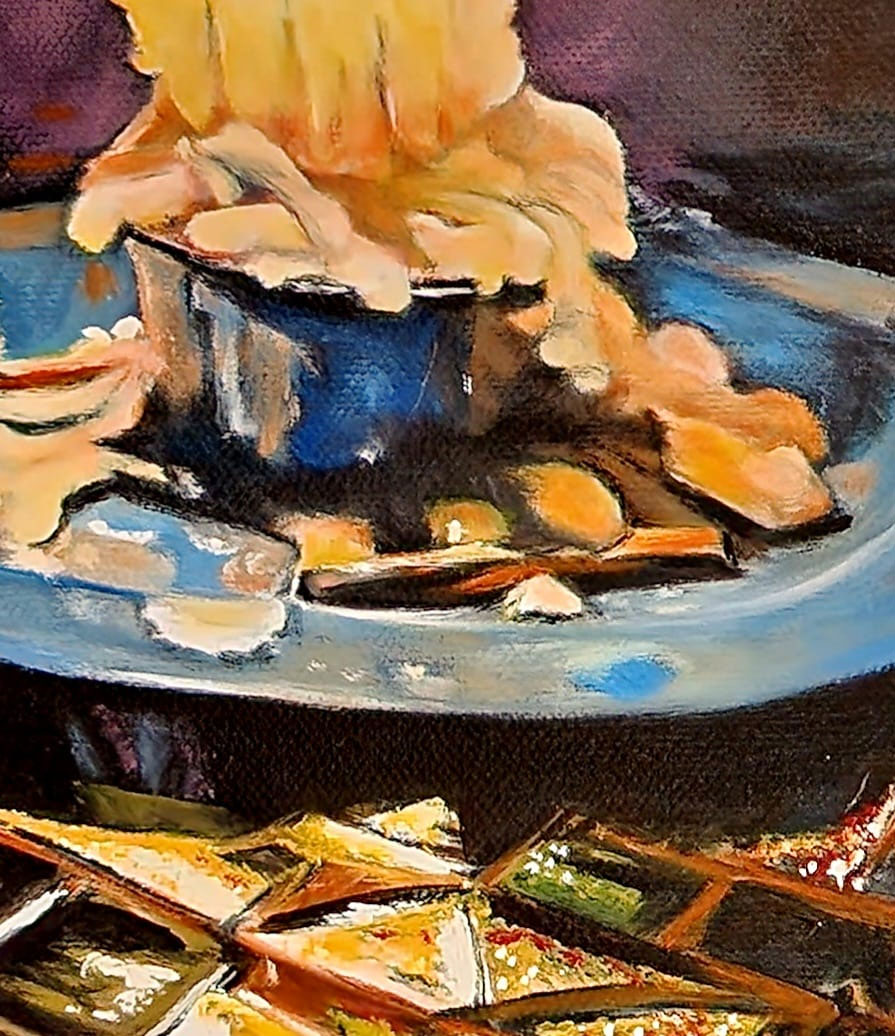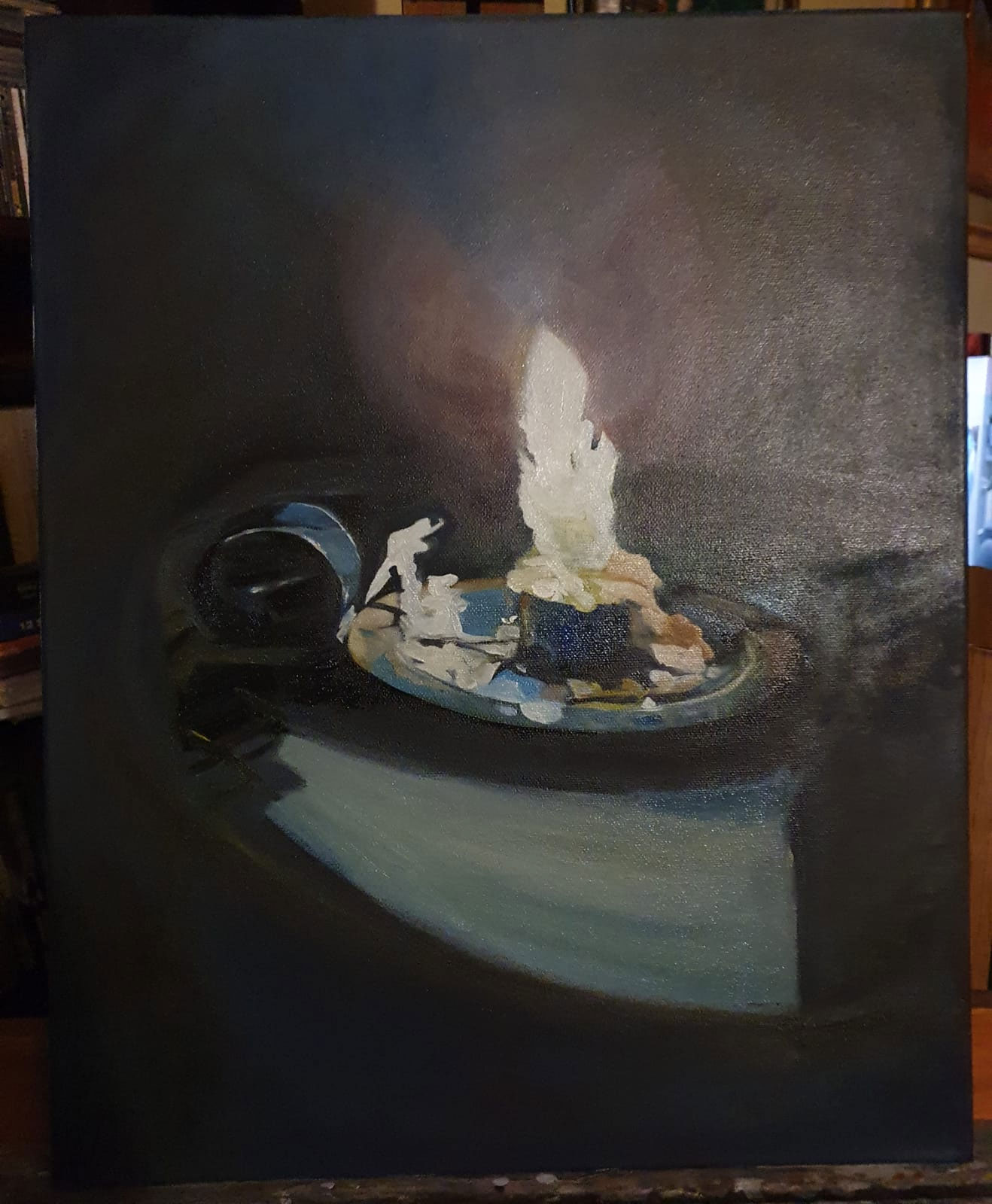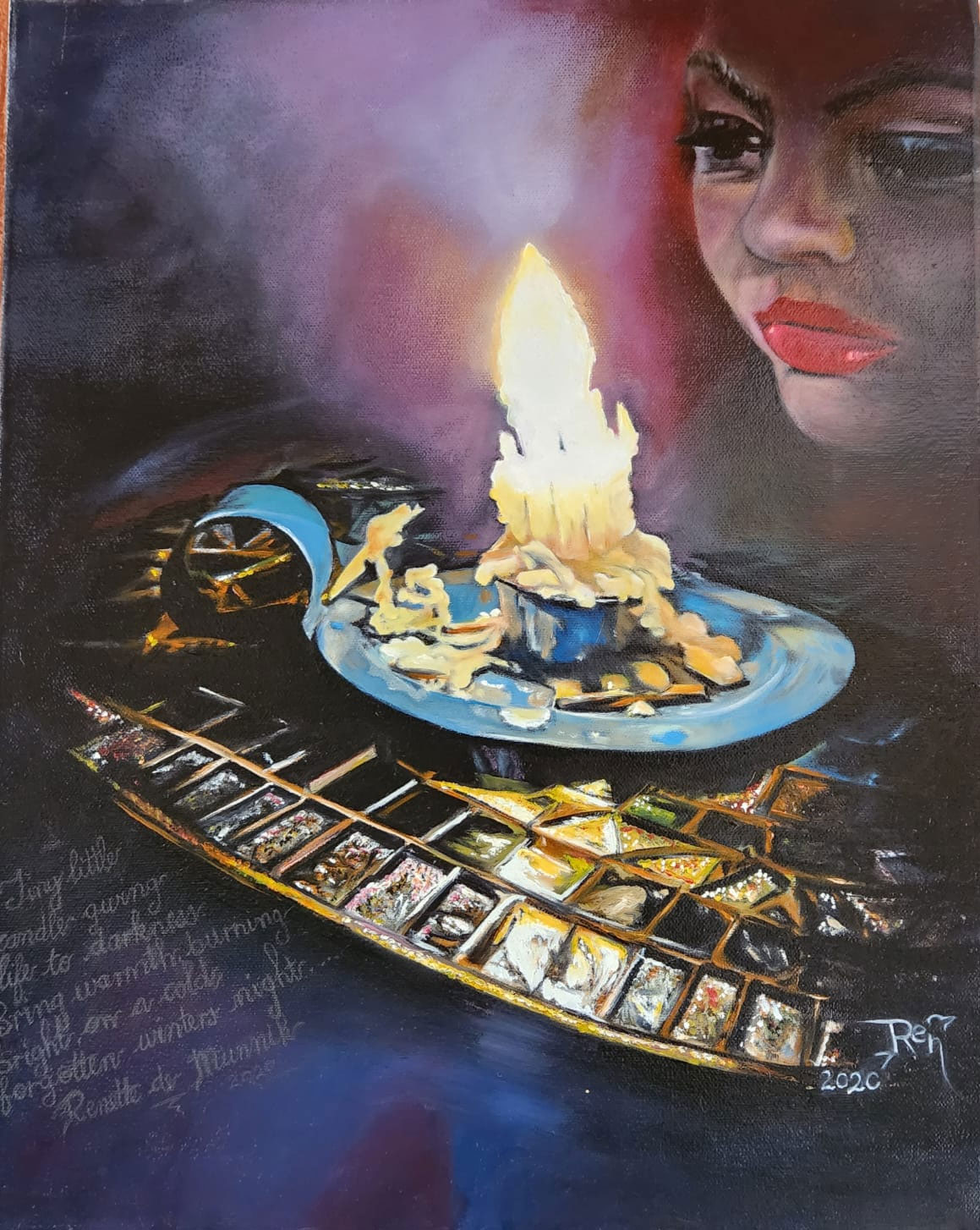 The candle casting its warm glow upon the intricately tiled mosaic table was a mesmerizing sight, begging to be immortalized. Amidst a power outage, I seized the opportunity to encapsulate this moment, freezing it in time through the lens of my camera. Little did I anticipate that the very mosaic table, a creation of my own hands, would one day be part of my oil painting. I found myself inspired to craft a poem, weaving words that mirrored the essence of this evocative scene. Truly, it is an authentic creation, a testament to the beauty that emerges from the depths of one’s own imagination.
